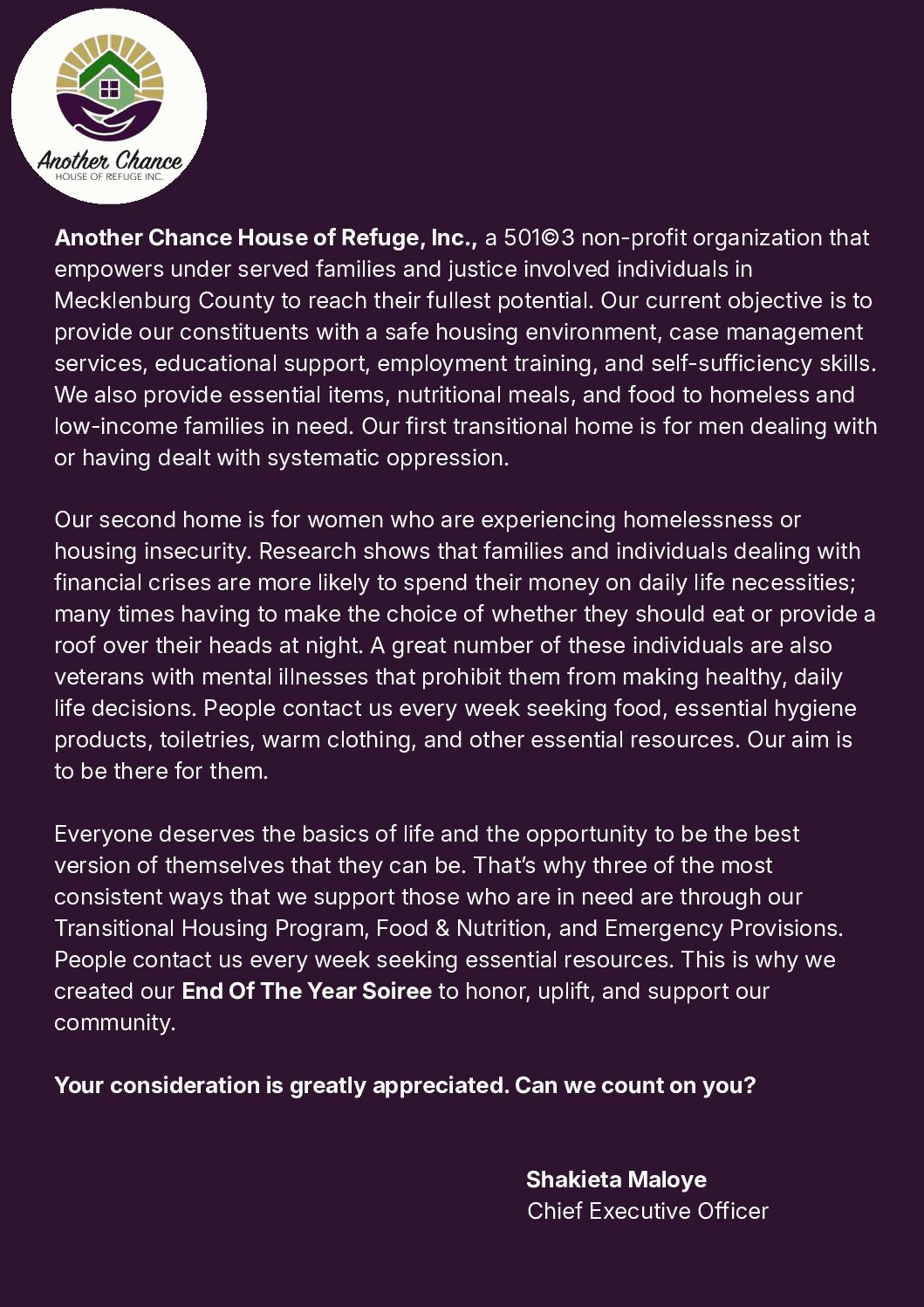 She has a deep compassion for suffering humanity and has often led the charge for raising the community’s conscious awareness around social issues that impact our less enfranchised citizens. Ms. Maloye is a focused and principle driven individual. Character and integrity are the hallmark of all her personal and business relationships. She believes that compassion, wisdom, discipline, and strategic awareness are qualities that cannot be compromised in building anything of substance. These are the very principles upon which she founded Another Chance: Hose of Refuge.